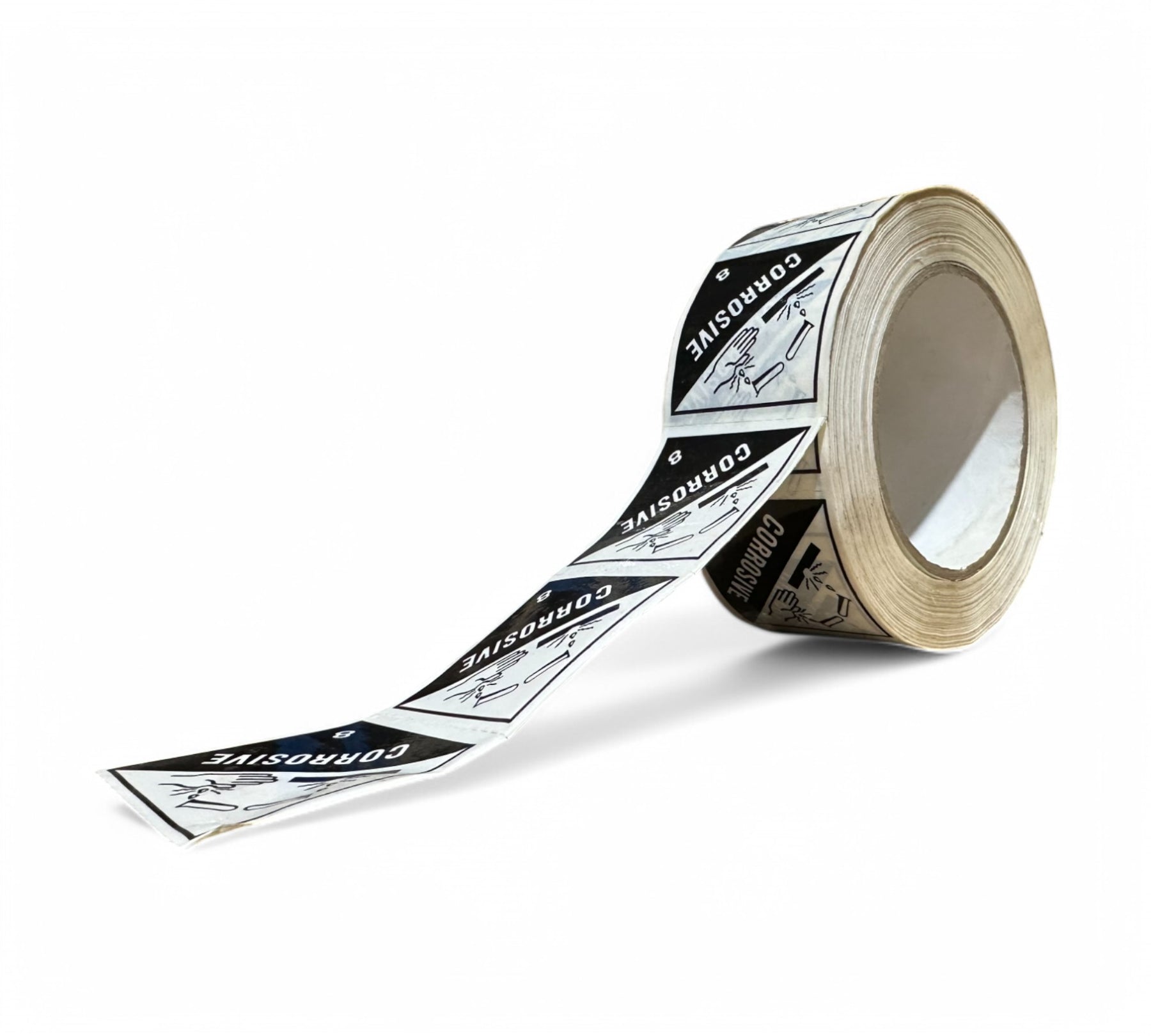 Clear and Recognizable Design: Featuring a prominent 'CORROSIVE 8' designation alongside universally recognized symbols, these labels provide immediate visual cues to handlers about the hazardous nature of the contents, facilitating appropriate safety measures.